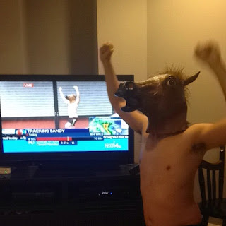 During Hurricane Sandy, a news reporter came across a shirtless man jogging while wearing a horse mask. See the video below.